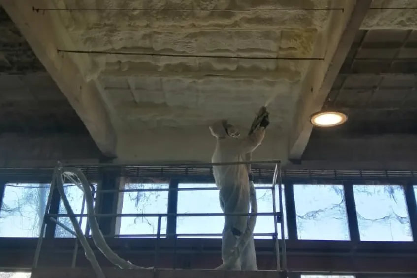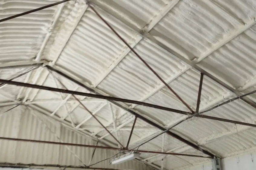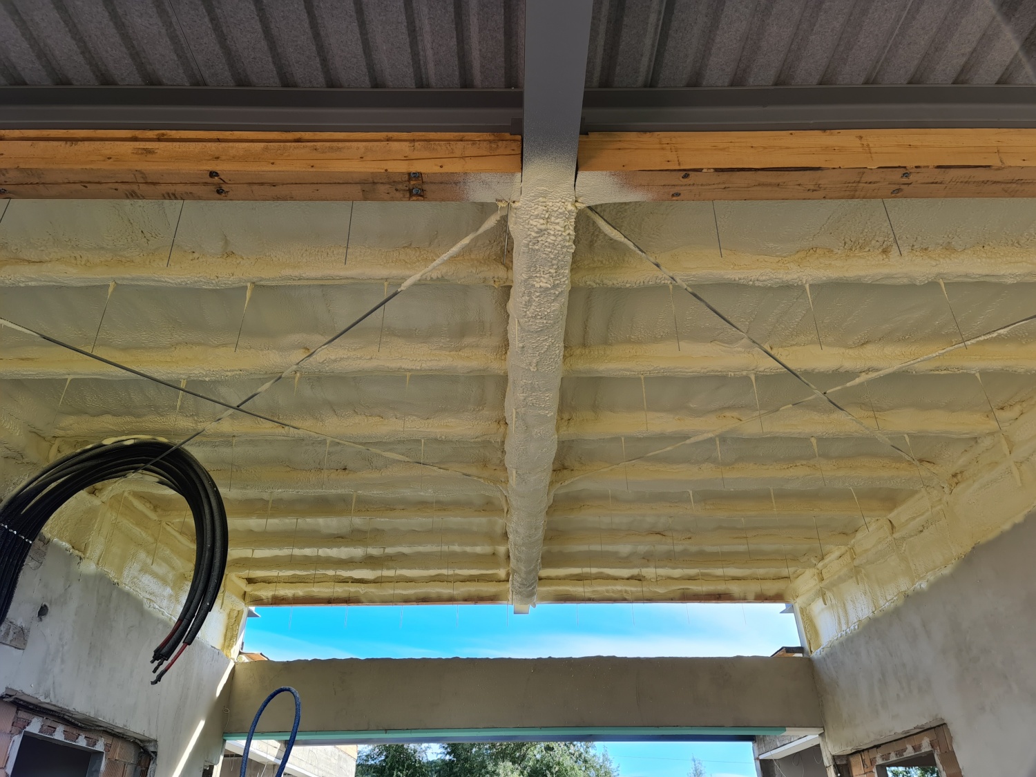 A trapézlemezes csarnokban a pára a mennyezeten csöpögött. 5–8 cm zárt cellás purhab került fel, amely páraféket, hőszigetelést ad, egybefüggő felülettel. A kicsapódás megszűnt, a belső klíma stabilabb és a gyorsaságunk miatt a munka nem állt le egy napra sem.